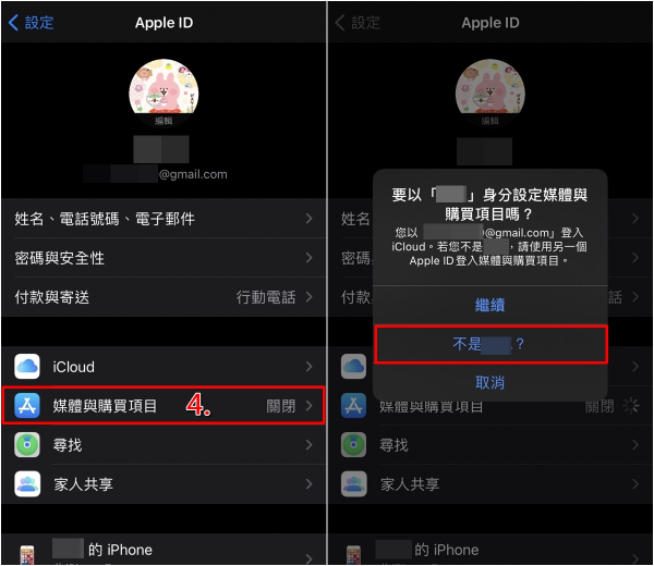 3)退出登录后,在 Apple ID 界面下再次点击“媒体与购买项目”,然后选择“不是 [你的旧账号名称]“