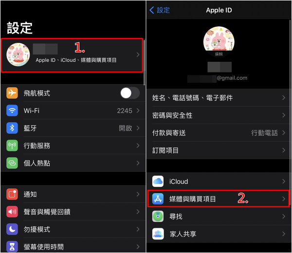 1)打开设置应用,点击进入 Apple ID,选择“媒体与购买项目”。