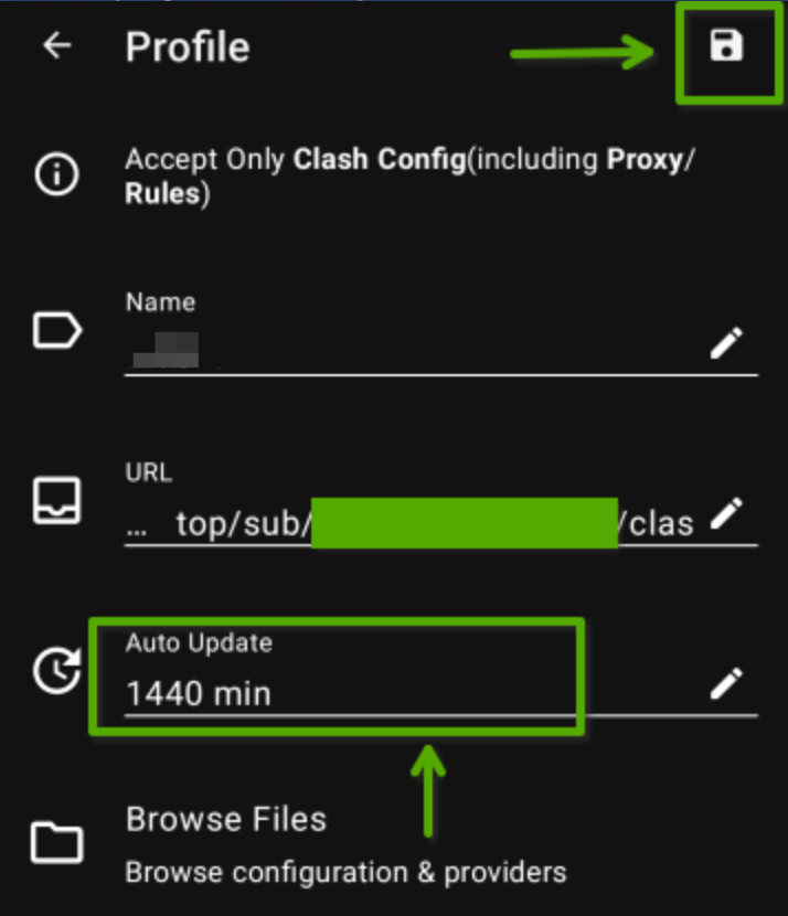 进入 Clash 界面后,设置自动更新建议写 1440 分钟(24 小时),点击右上角的保存。