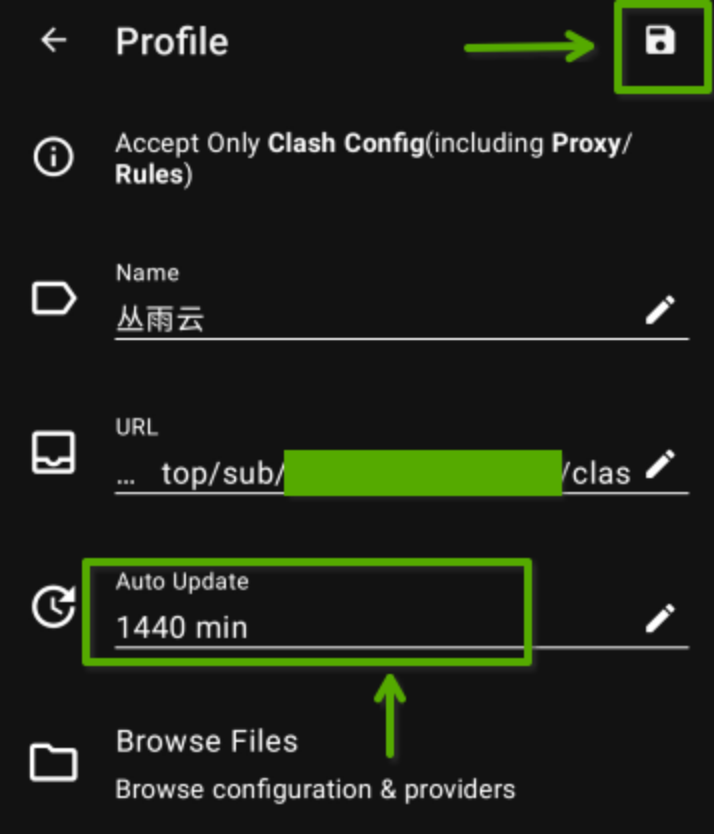 在配置页面中,如图所示,名称写「丛雨云」,URL 粘贴刚才复制的订阅链接,自动更新建议写 1440 分钟(24 小时),点击右上角的保存。