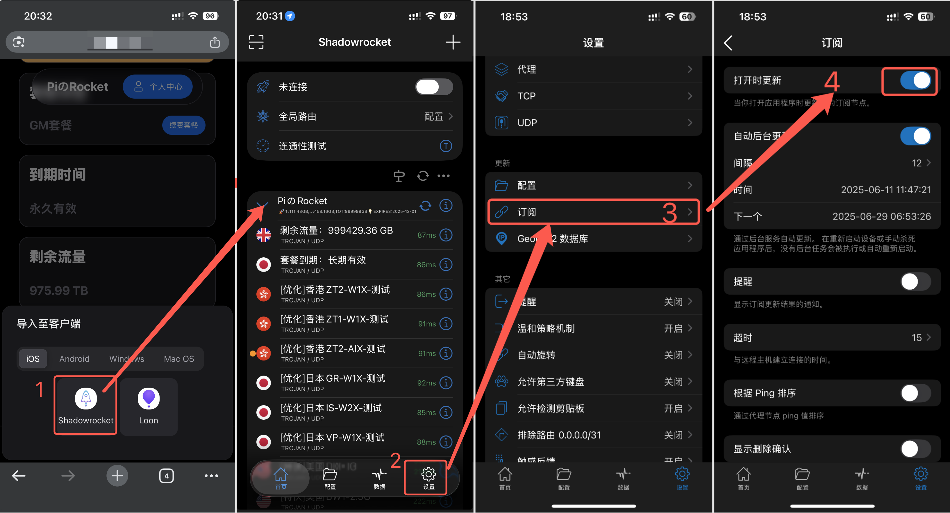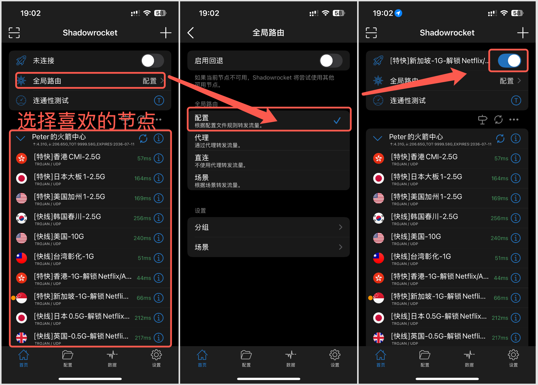 1)导入登录官网个人中心,选择“导入客户端”,点击图标导入节点配置导入成功后,点击底栏的 设置 -> 服务器订阅 -> 启用 打开时更新这样以后每次打开客户端都会自动更新最新节点2)开启代理回到首页,点击进入全局路由将其更改为 配置在节点列表中选择节点,小黄点表示当前选择的节点点击最顶上的开关开启代理如果是首次开启会弹出VPN文件的应用,务必点击Allow并验证之后就可以愉快上网啦