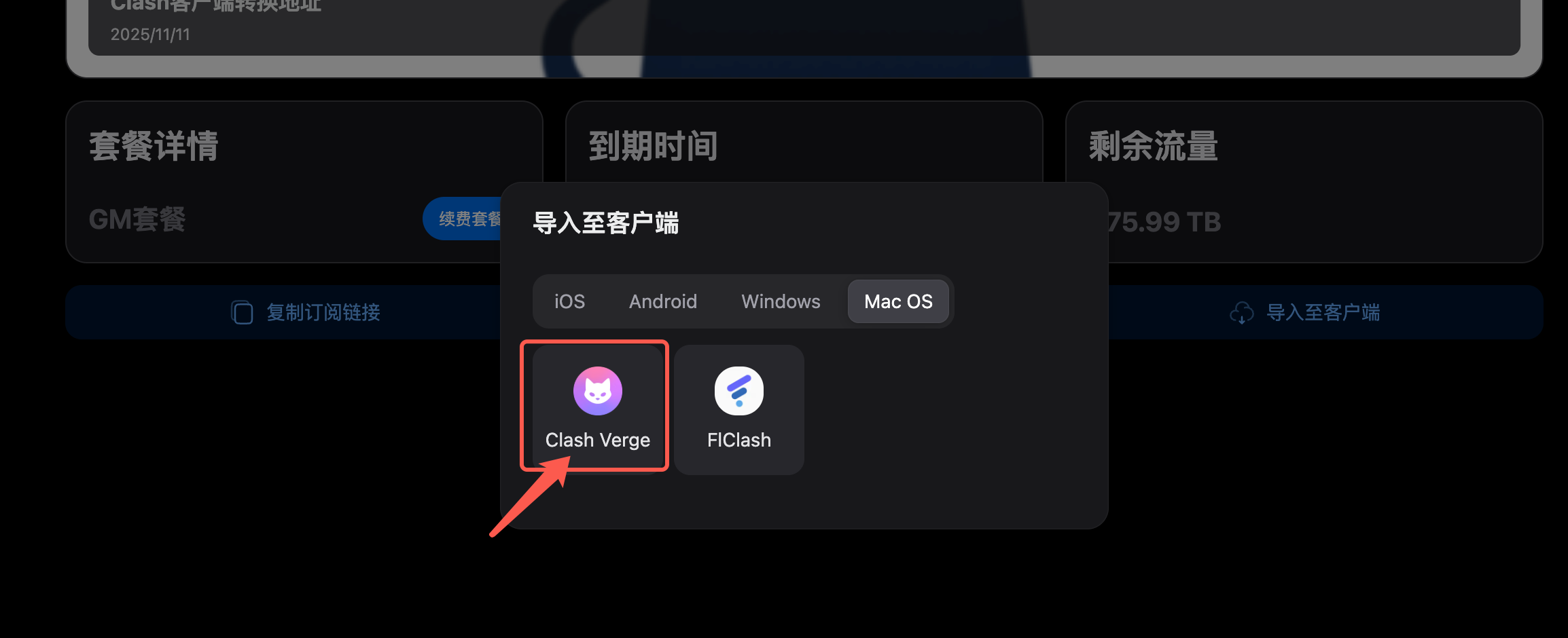 登录官网个人中心,选择导入客户端,点击图标导入节点配置